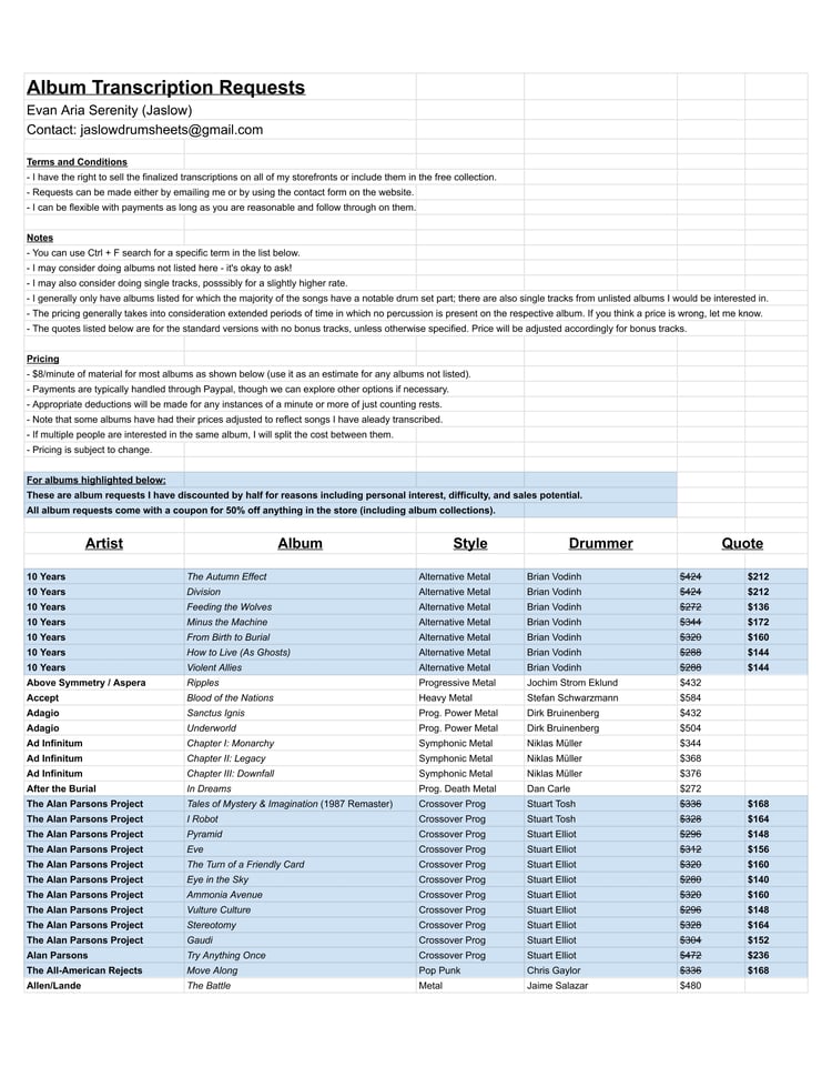 Many of the albums on the transcription requests spreadsheet are now highlighted with updated quotes. These are albums I have discounted by half for reasons including personal interest, difficulty, and sales potential. A large portion of them are available to request for under $200.