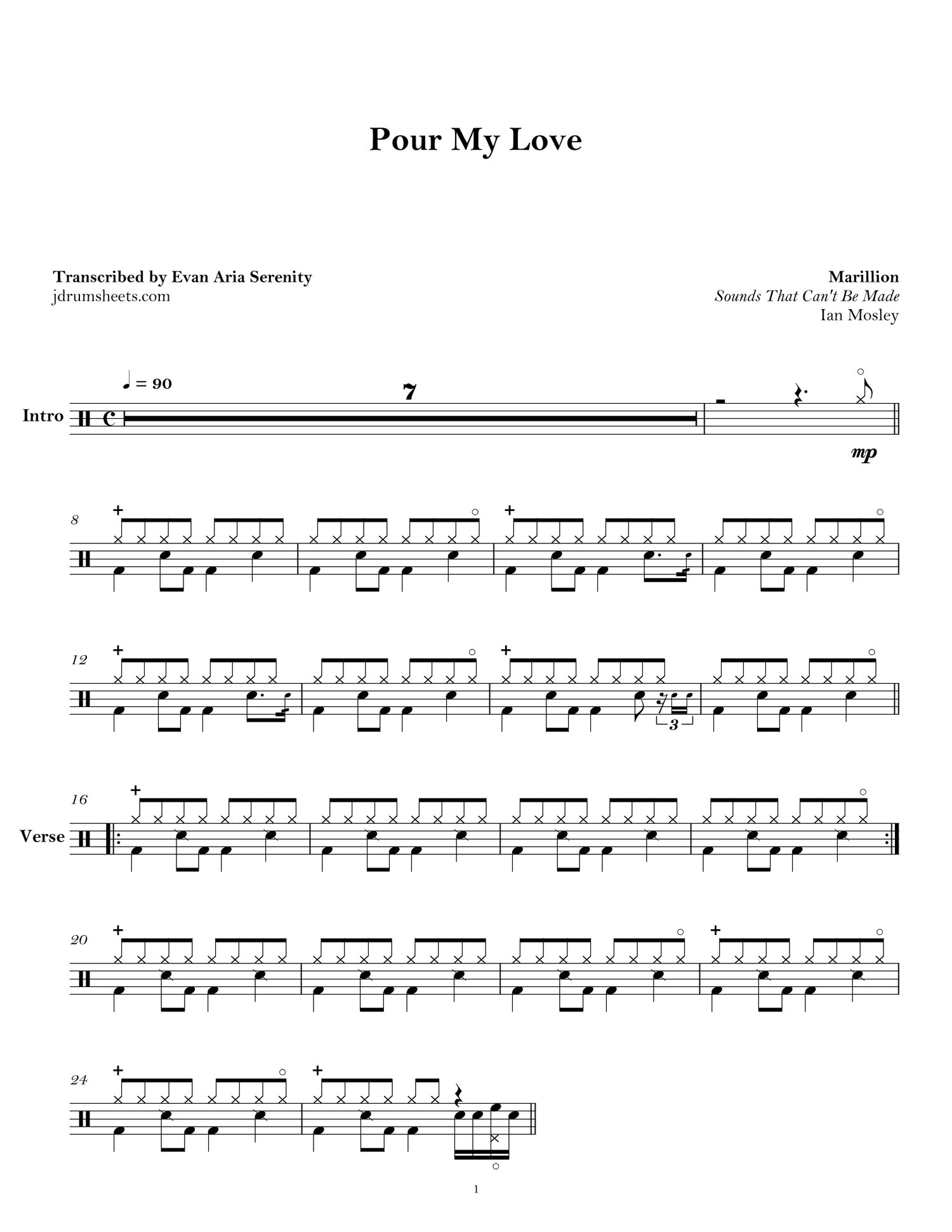 Drum sheet music transcription for "Pour My Love" by Marillion, from the album Sounds That Can't Be Made (2012). Drums by Ian Mosley. Soft rock, difficulty 2/5.