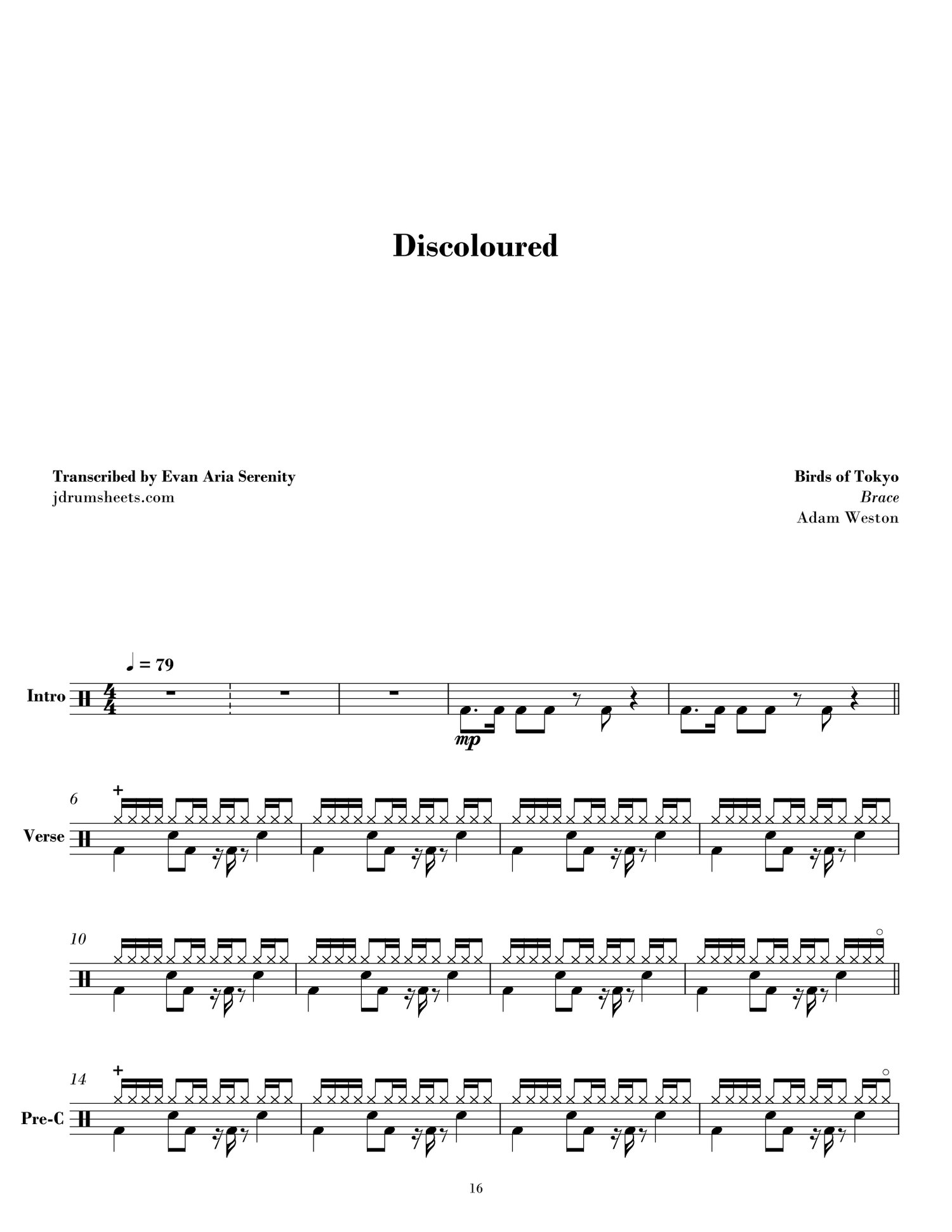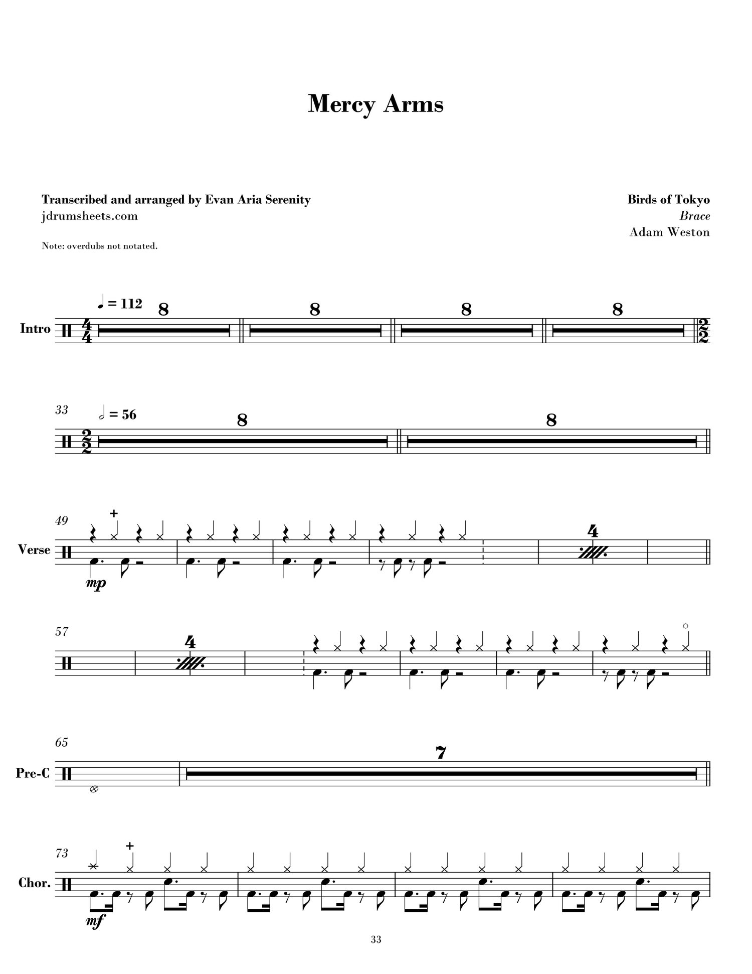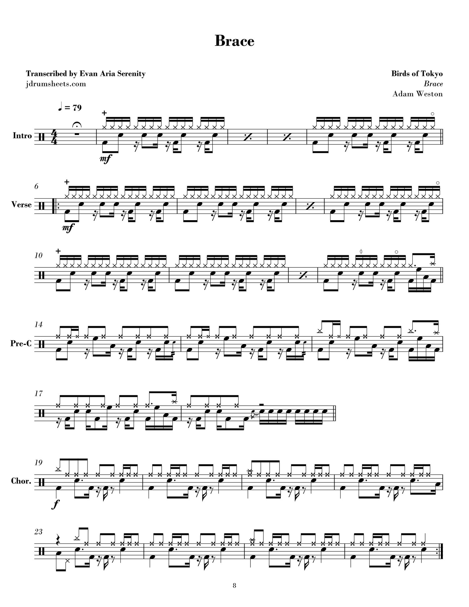 Drum sheet music transcriptions for the entirety of Birds of Tokyo's 2016 album, Brace. Drums by Adam Weston. Alternative rock, overall difficulty 3/5.