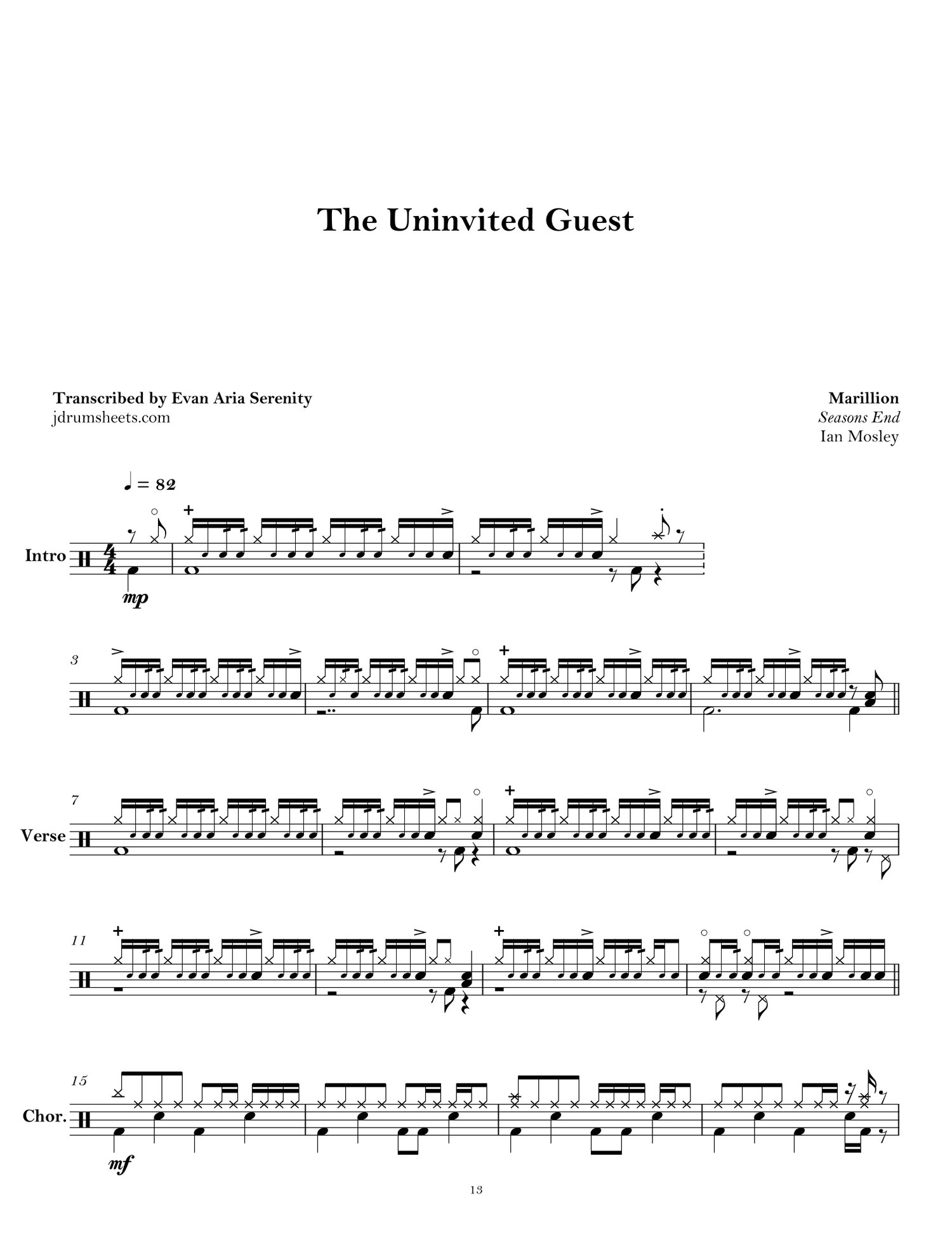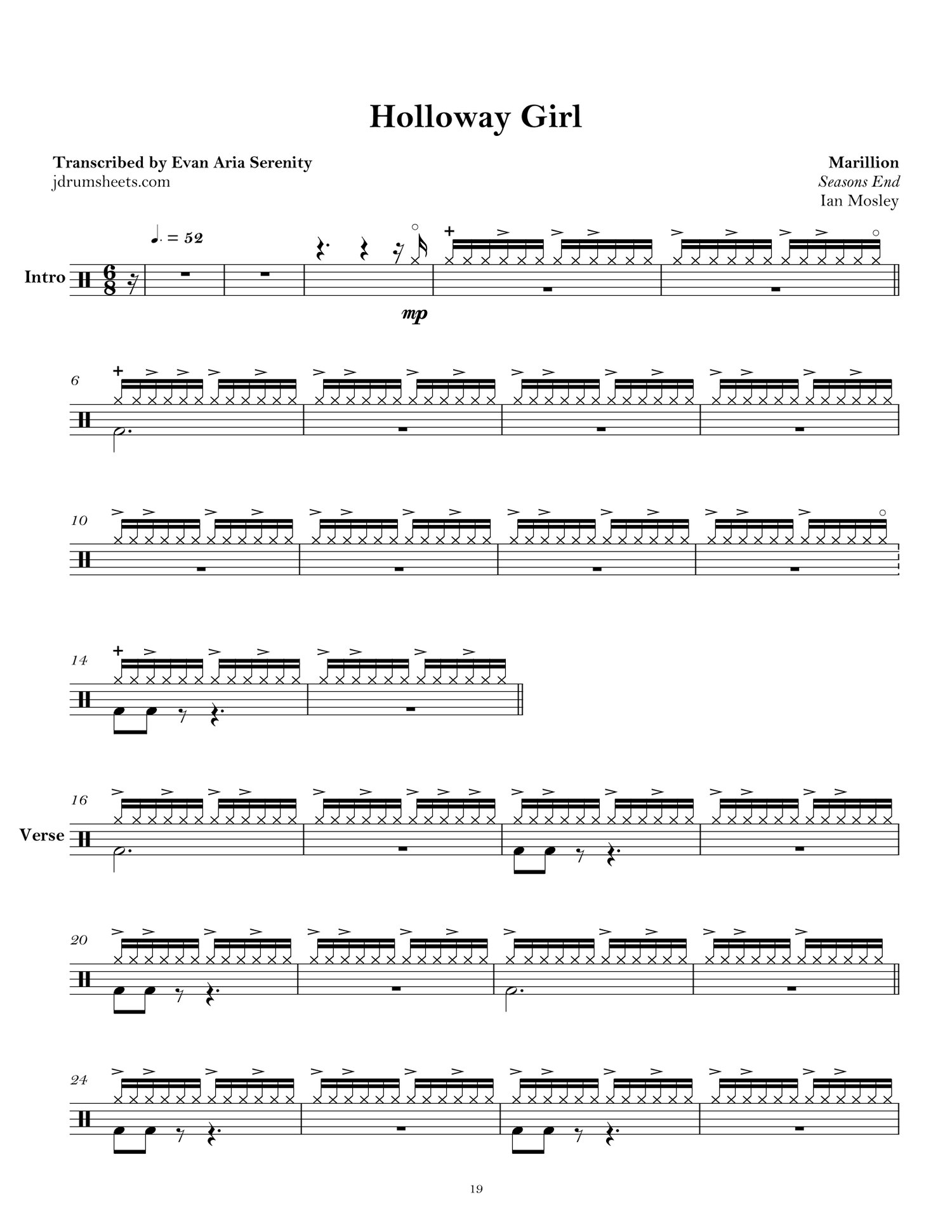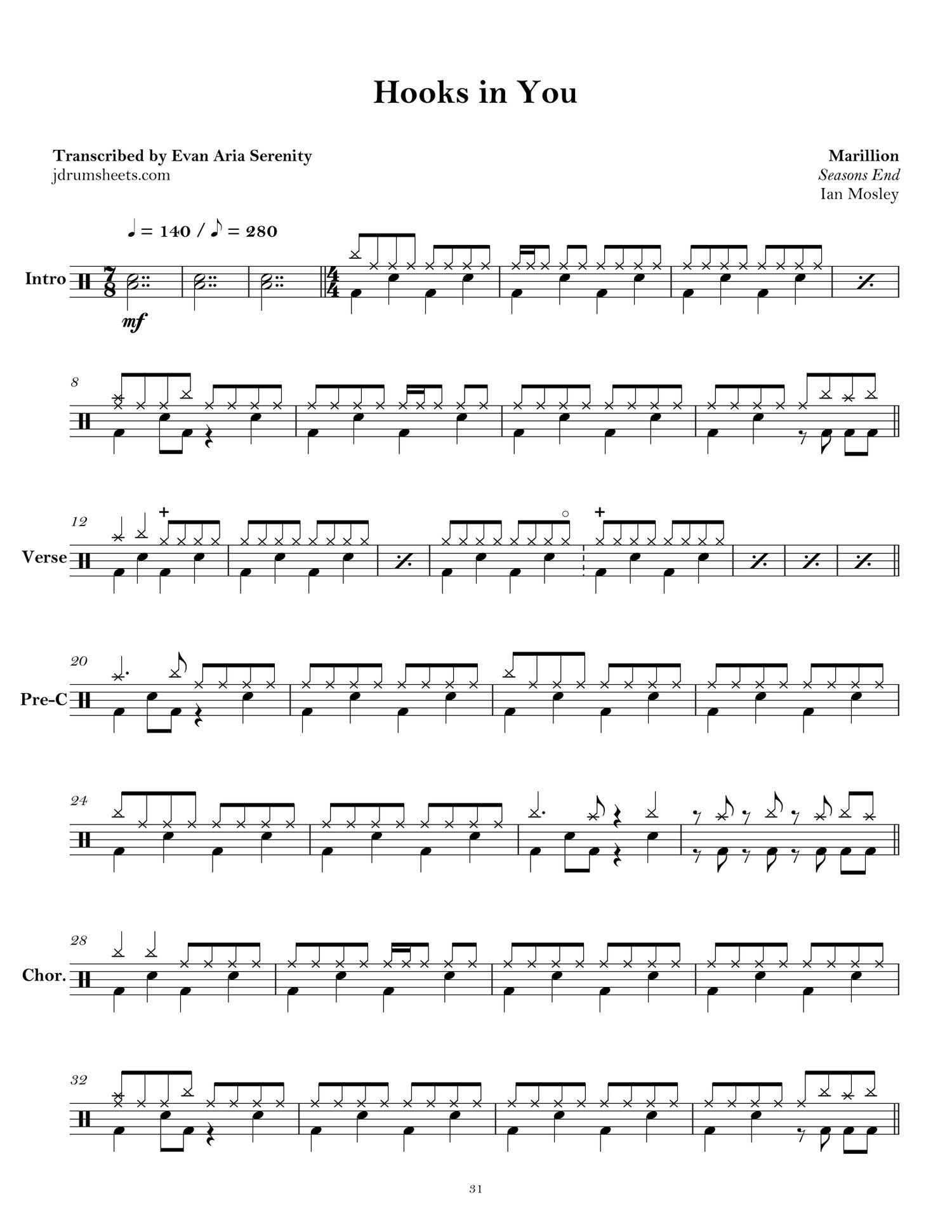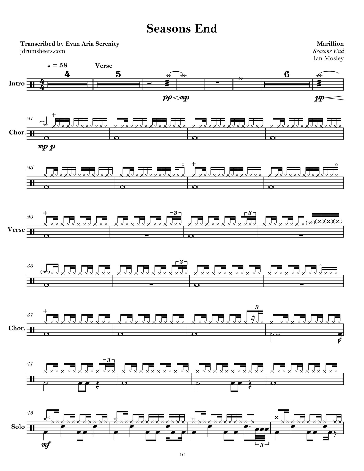 Drum tab sheet music transcriptions for the entirety of Marillion's 1989 album Seasons End, their first with Steve Hogarth. Drums by Ian Mosley. Progressive rock, overall difficulty 4/5.