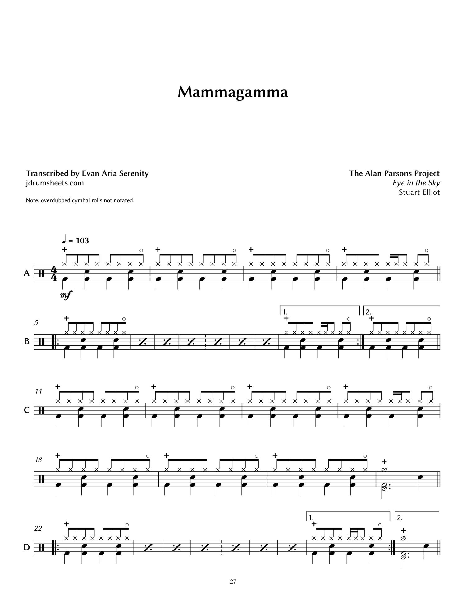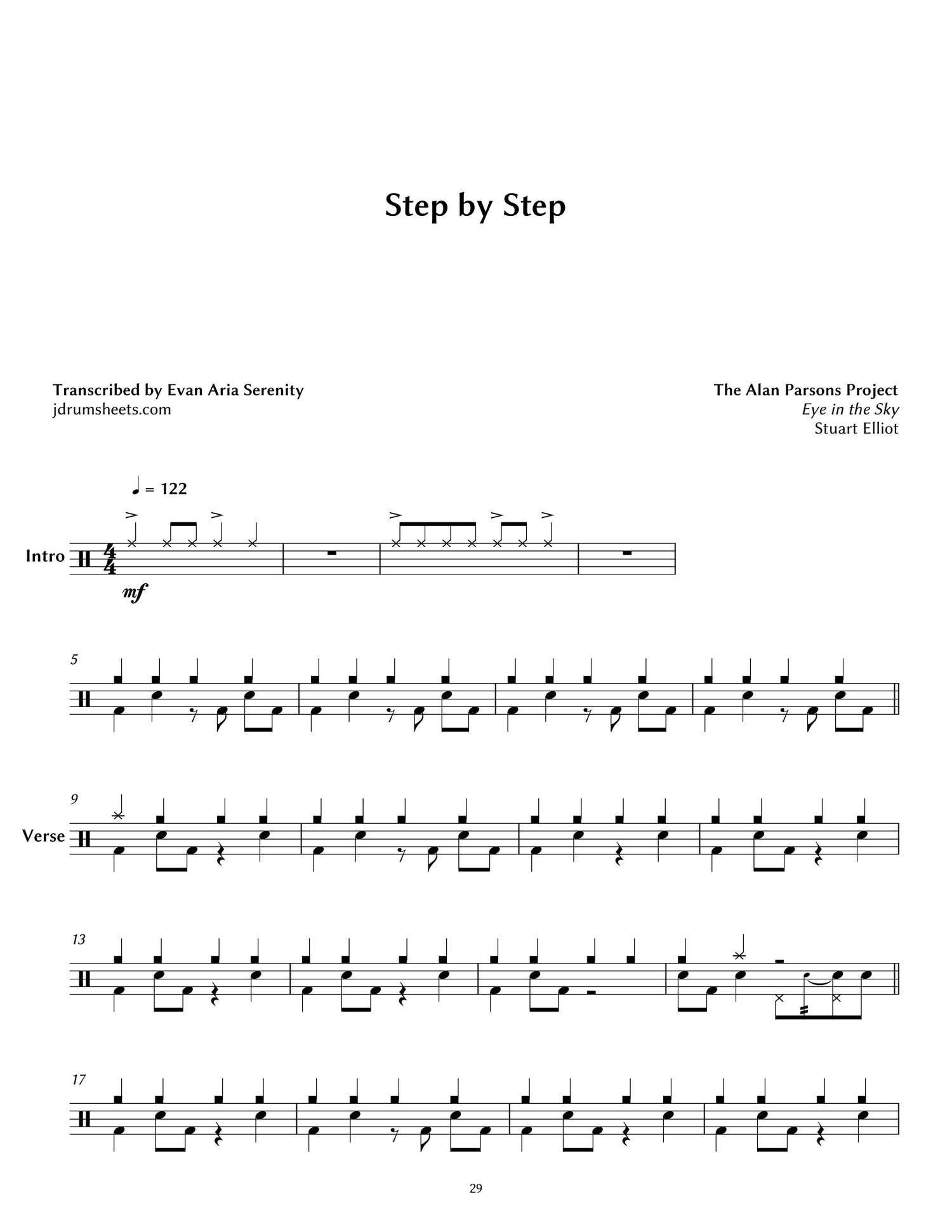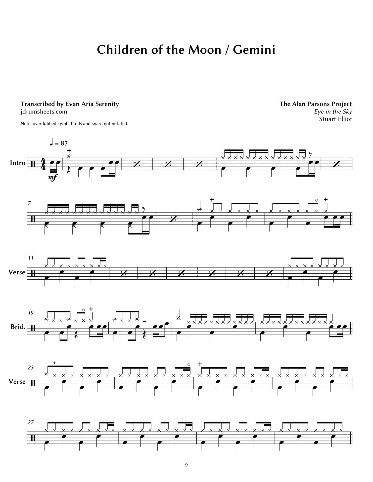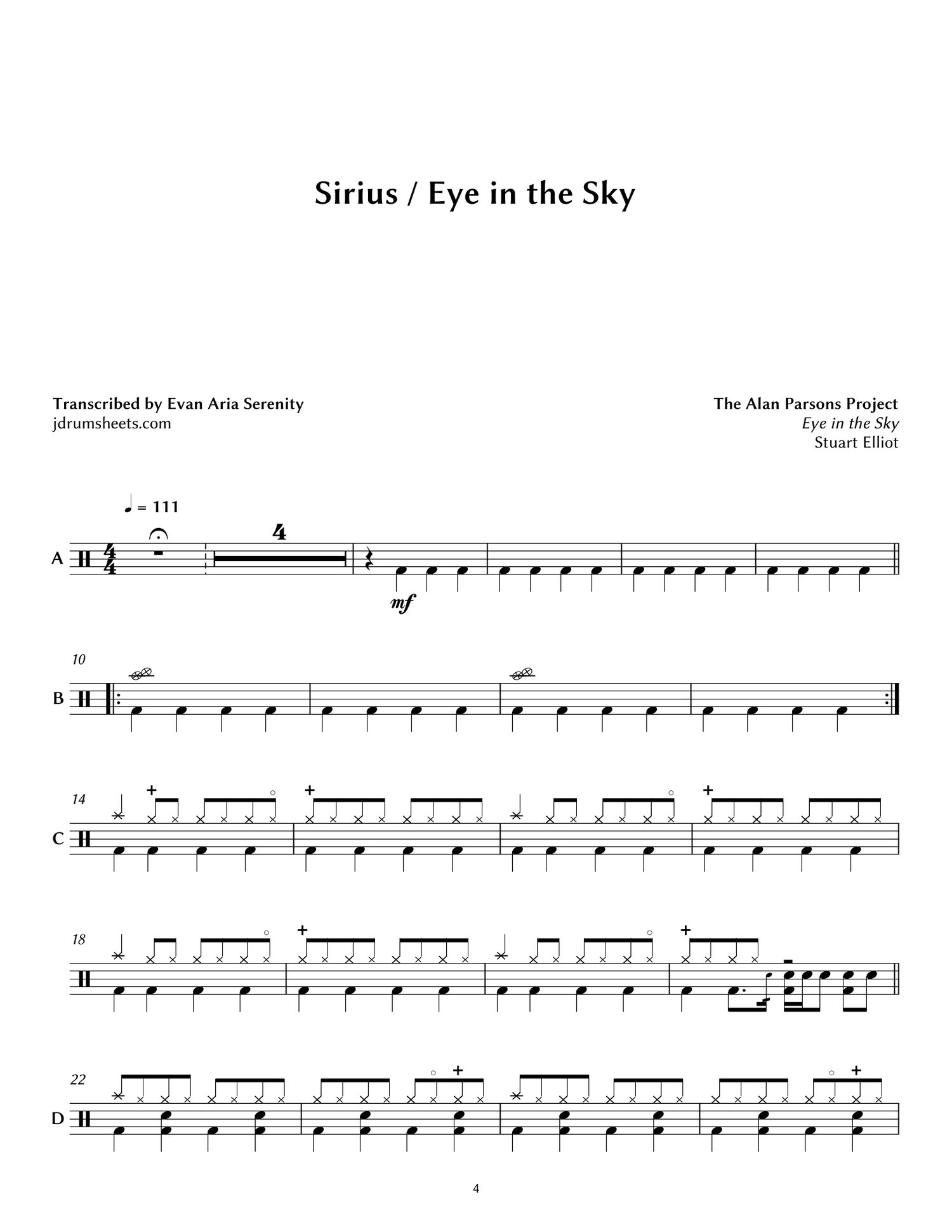 Drum sheet music transcriptions for the entirety of The Alan Parsons Project 1982 album, Eye in the Sky. Drums by Stuart Elliot. Crossover prog, overall difficulty 3/5.