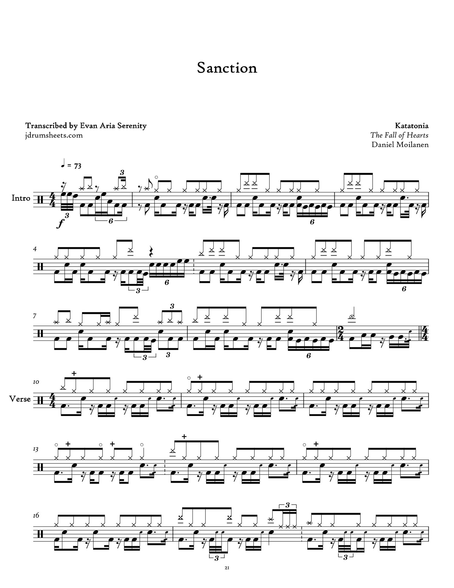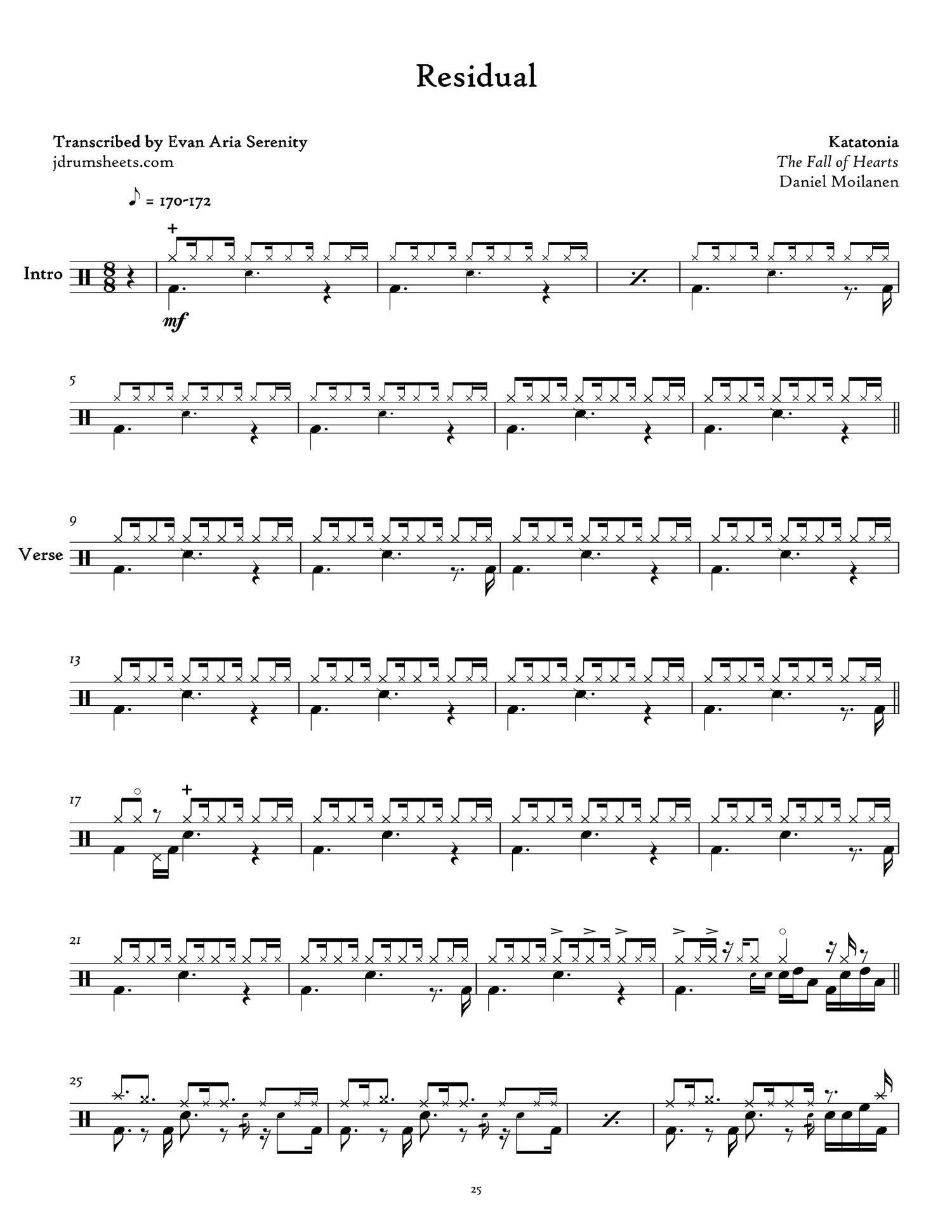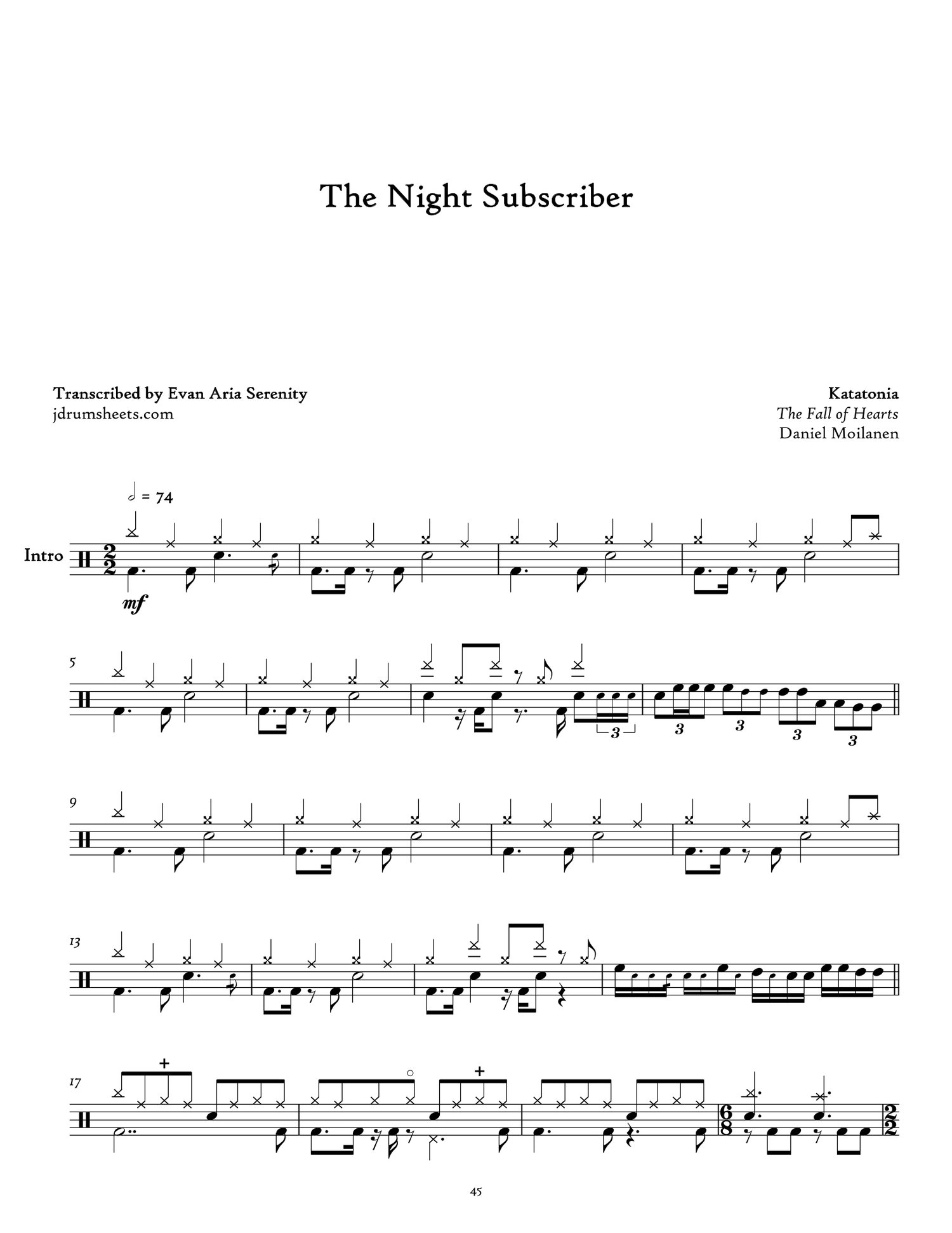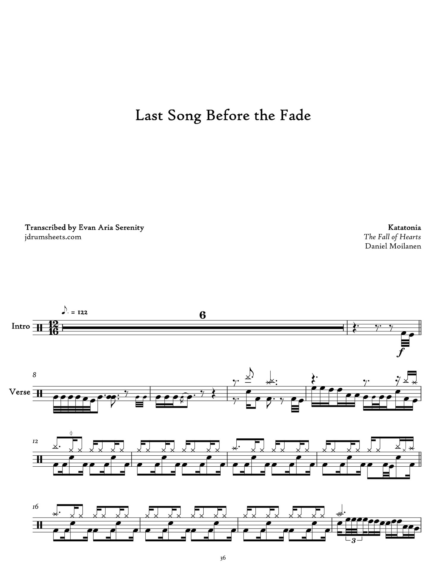 Drum sheet music transcriptions for the entirety of Katatonia's 2016 album, The Fall of Hearts. Drums by Daniel Moilanen. Progressive rock/metal, overall difficulty 5/5.