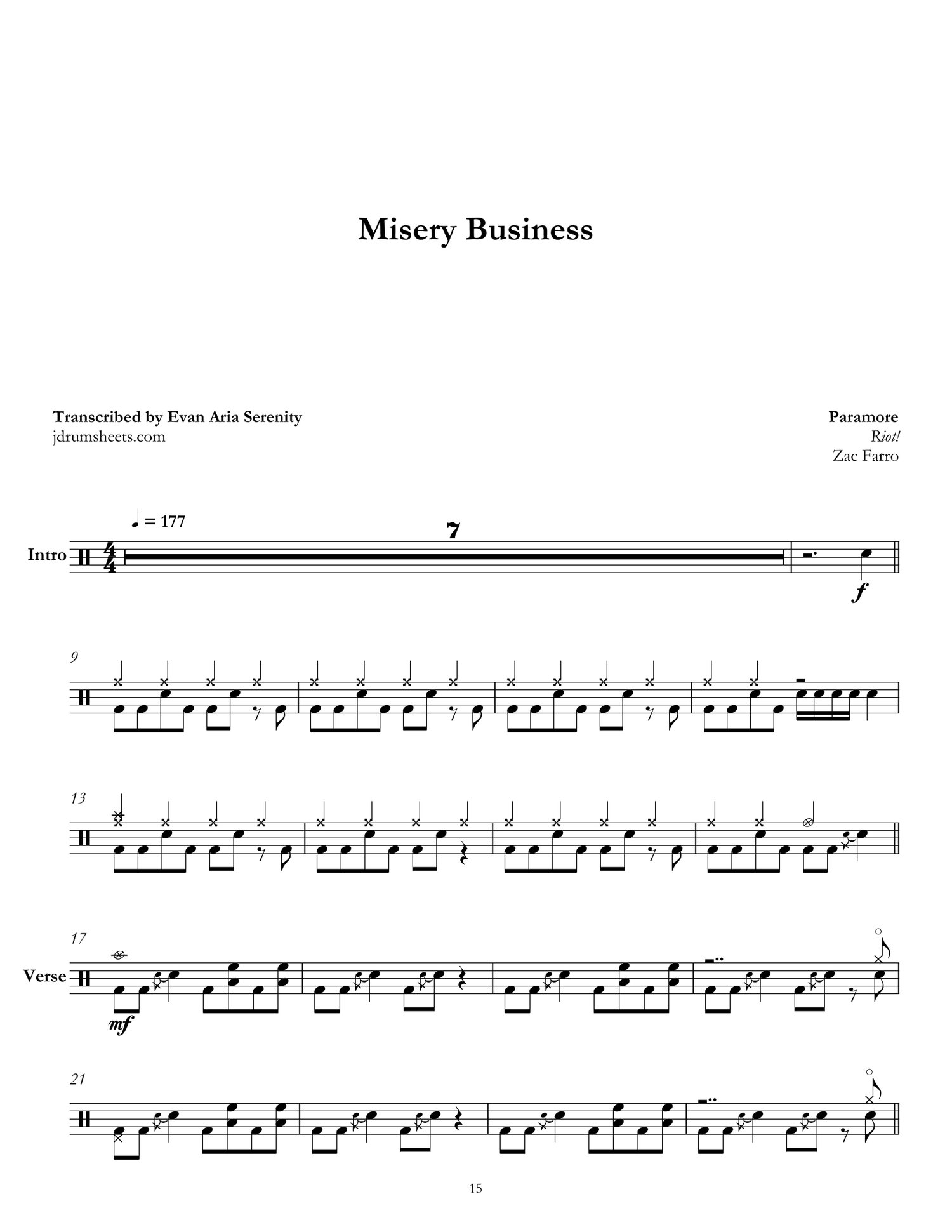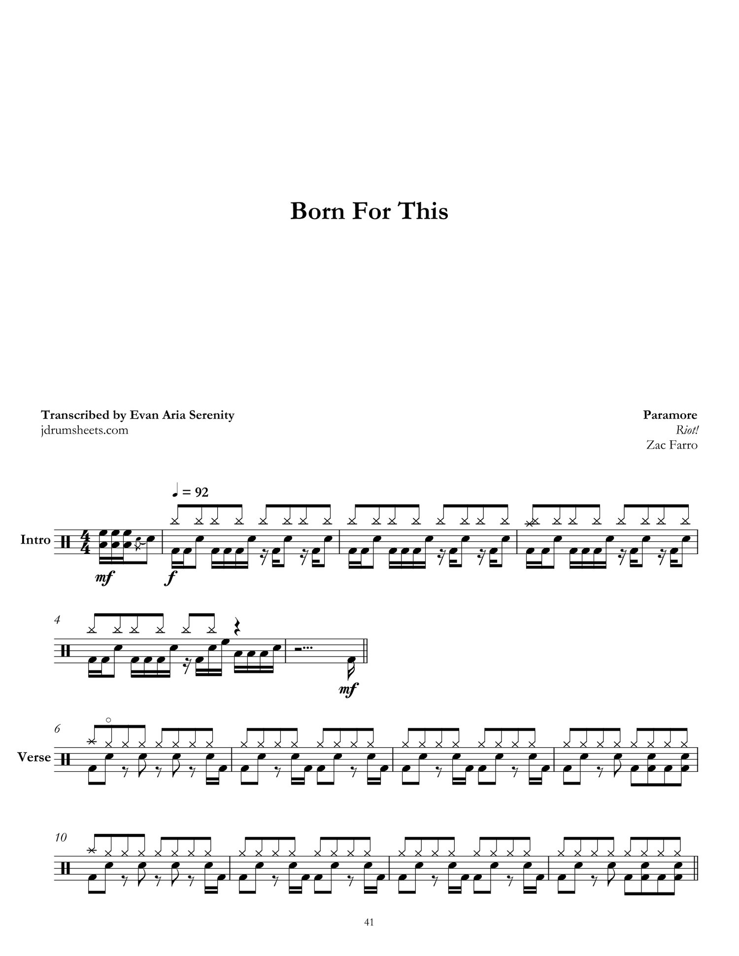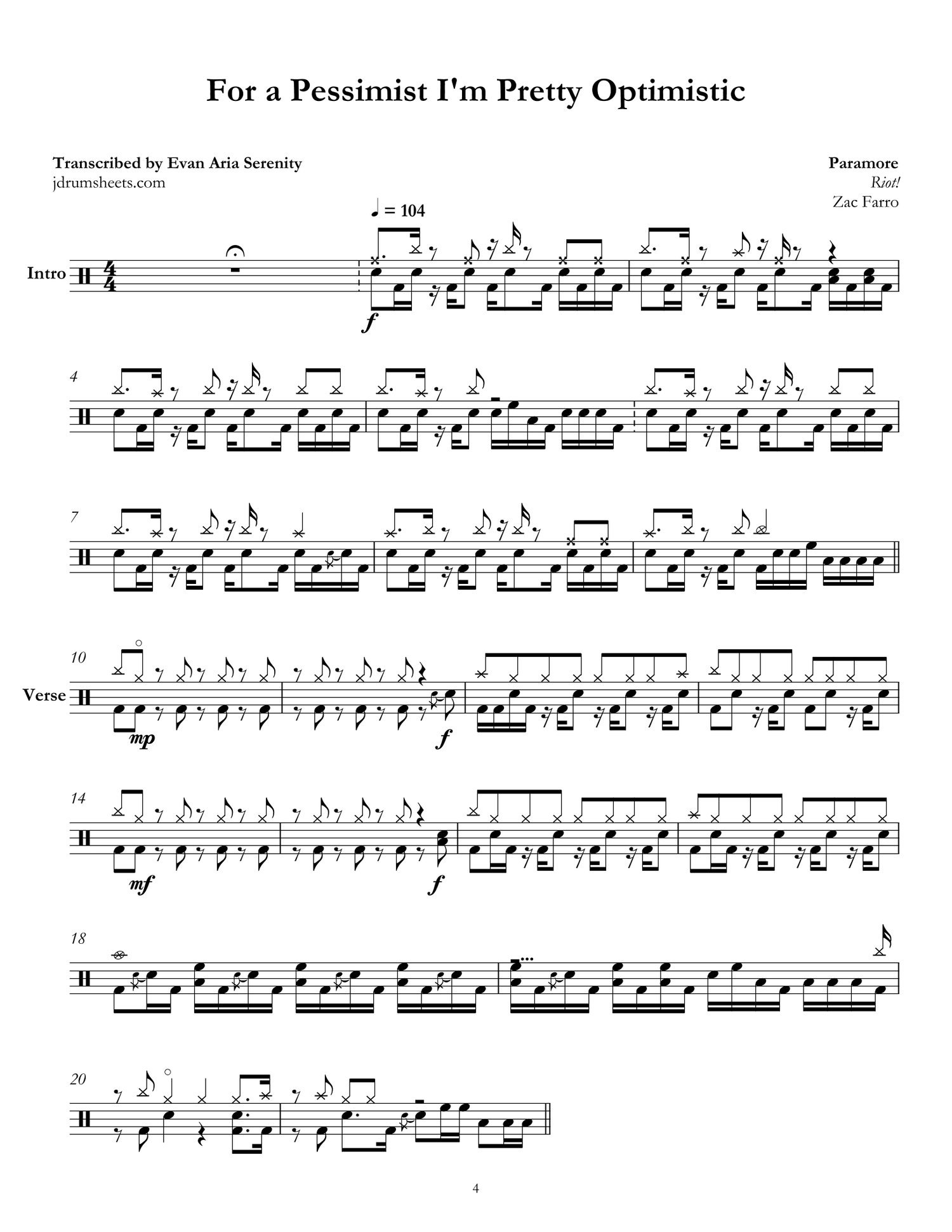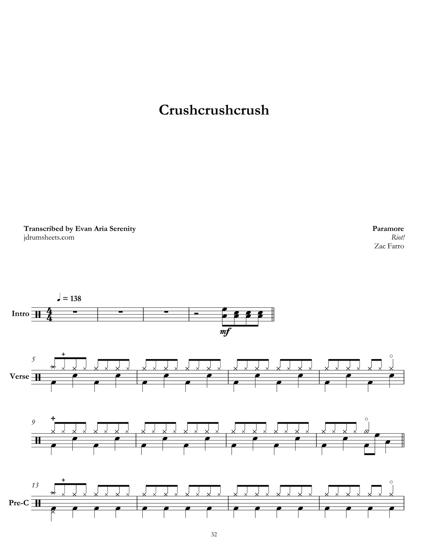 Drum sheet music transcriptions for the entirety of Paramore's sophomore album Riot!, released in 2007. Drums by Zac Farro. Pop punk, overall difficulty 3/5.