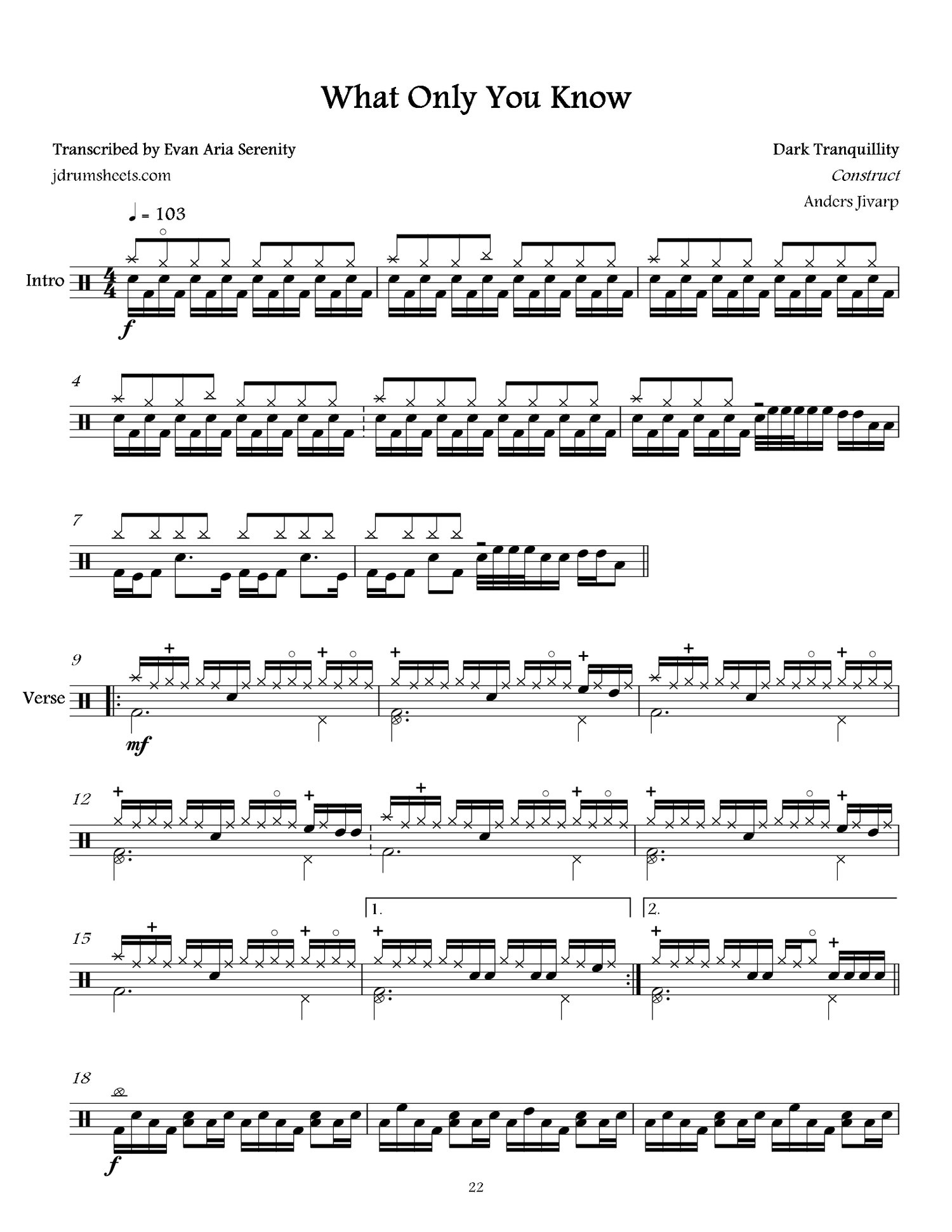 Drum sheet music transcriptions for the entirety of Dark Tranquillity's 2013 album Construct. Drums by Anders Jivarp. Melodic death metal, overall difficulty 4/5.