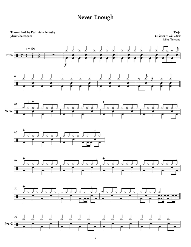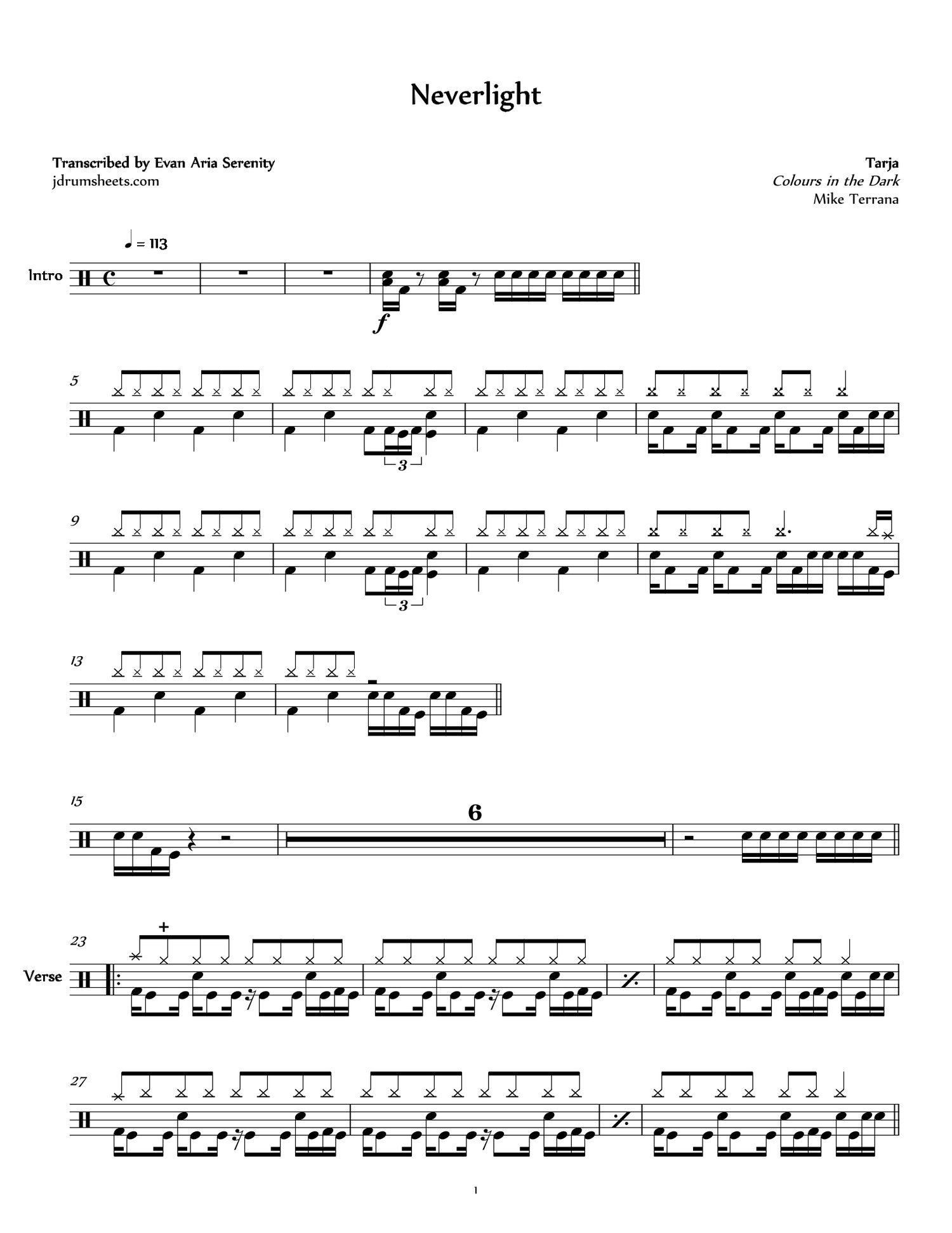 Drum sheet music transcription for "Neverlight" by Tarja, from the album Colours in the Dark (2013). Drums by Mike Terrana. Symphonic metal, difficulty 4/5.